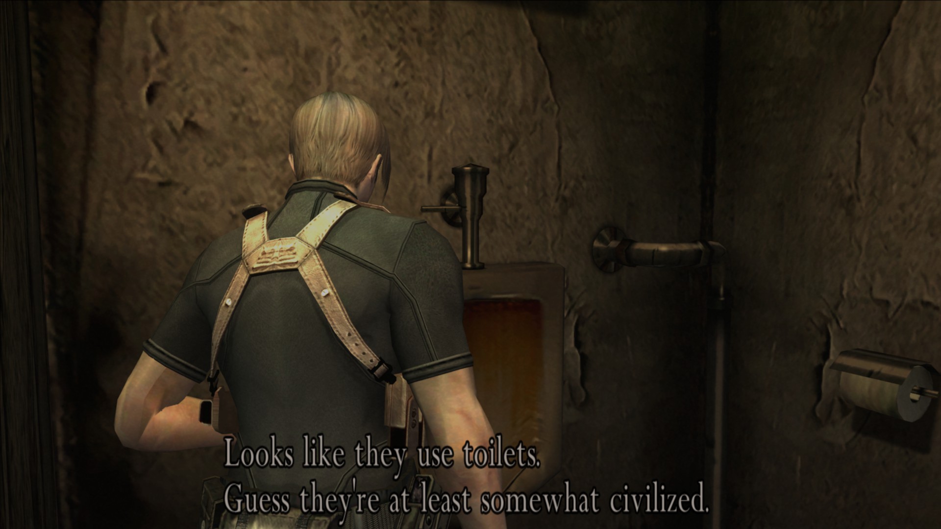 Approximately three frames later, we see a shot of Leon walking up to, as I had thought, a convenience store of some kind. This is probably from a cutscene, but I’ll get into that later.
